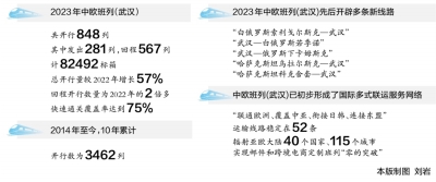 如今,铁路信息与海关信息共享,海关对铁路舱单电子数据进行审核、核销放行,全程不到30分钟。2023年,中欧班列(武汉)快速通关覆盖率达到75%。数据显示:2014年至今,中欧班列(武汉)10年累计开行数为3462列。