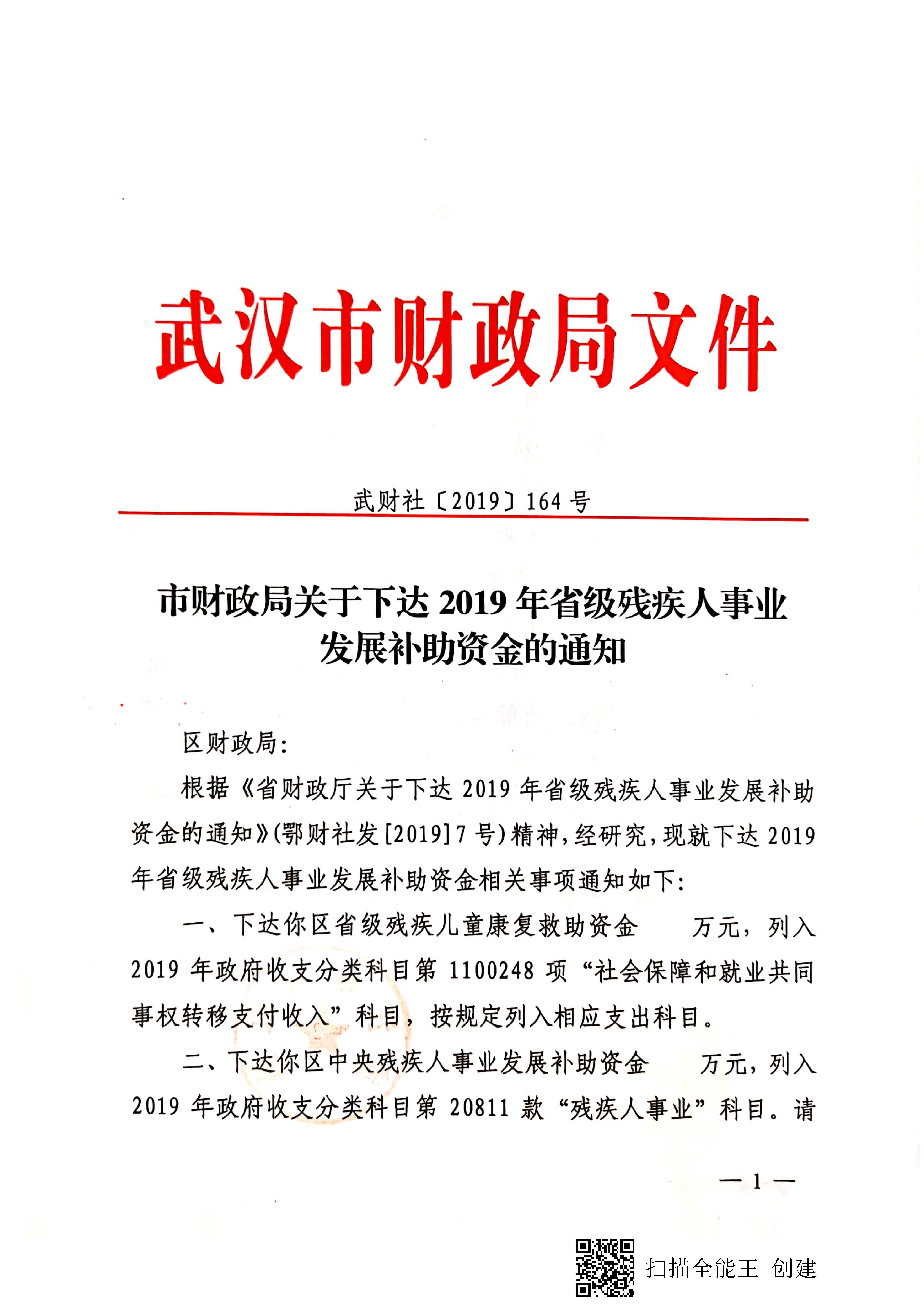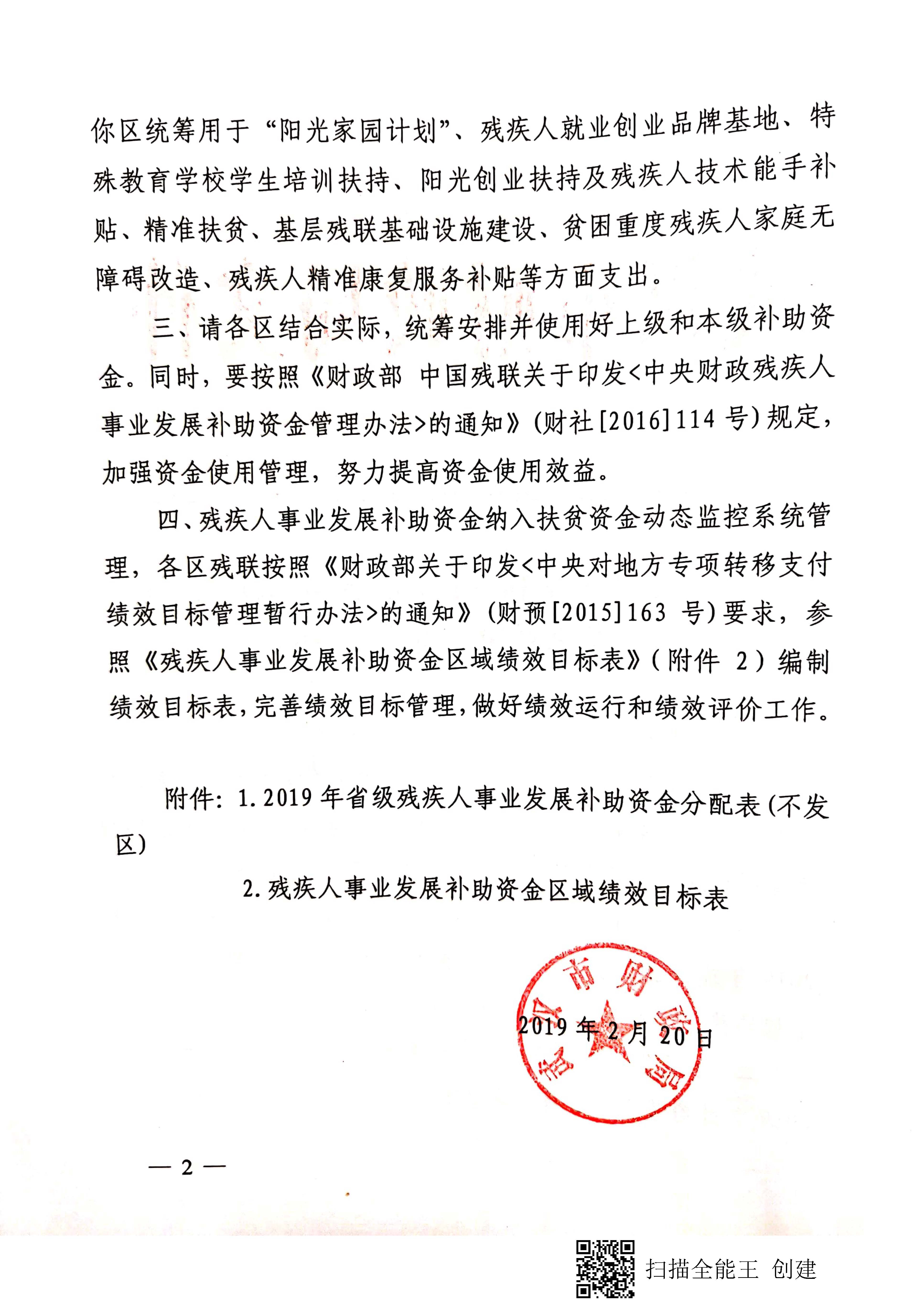 关于下达2019年省级残疾人事业发展补助资金的通知