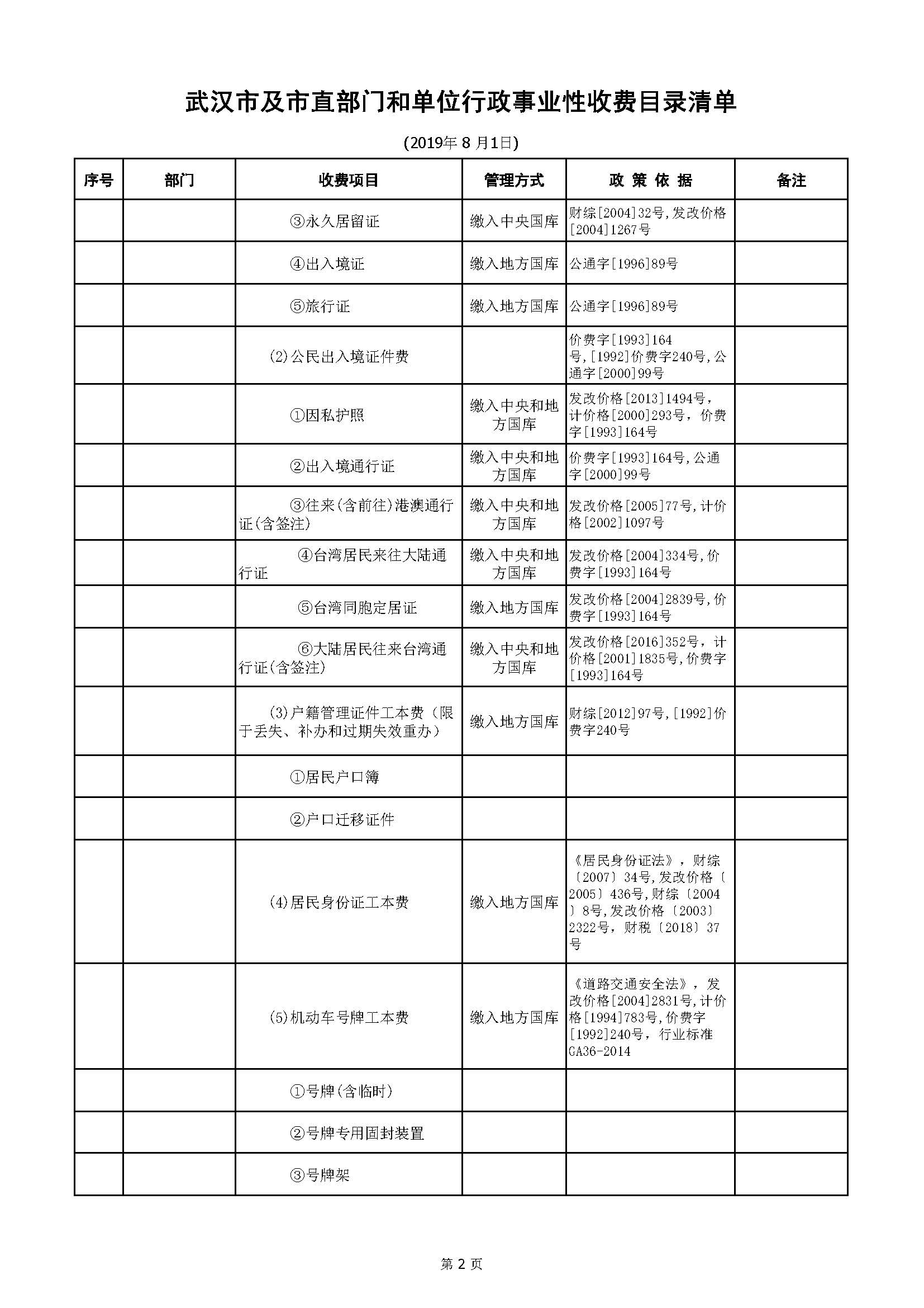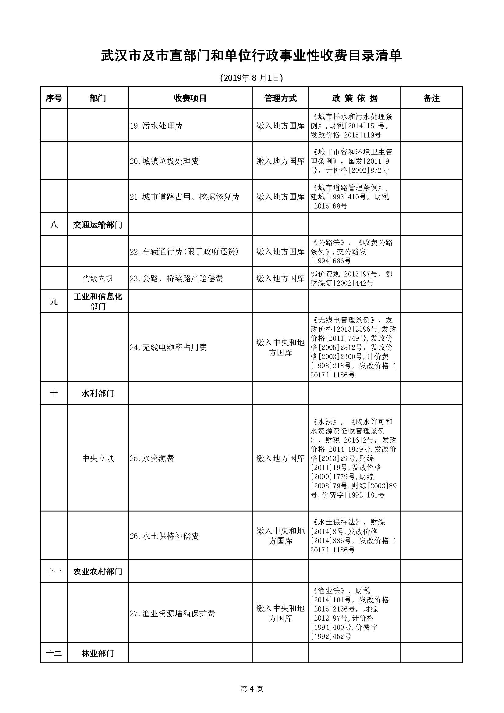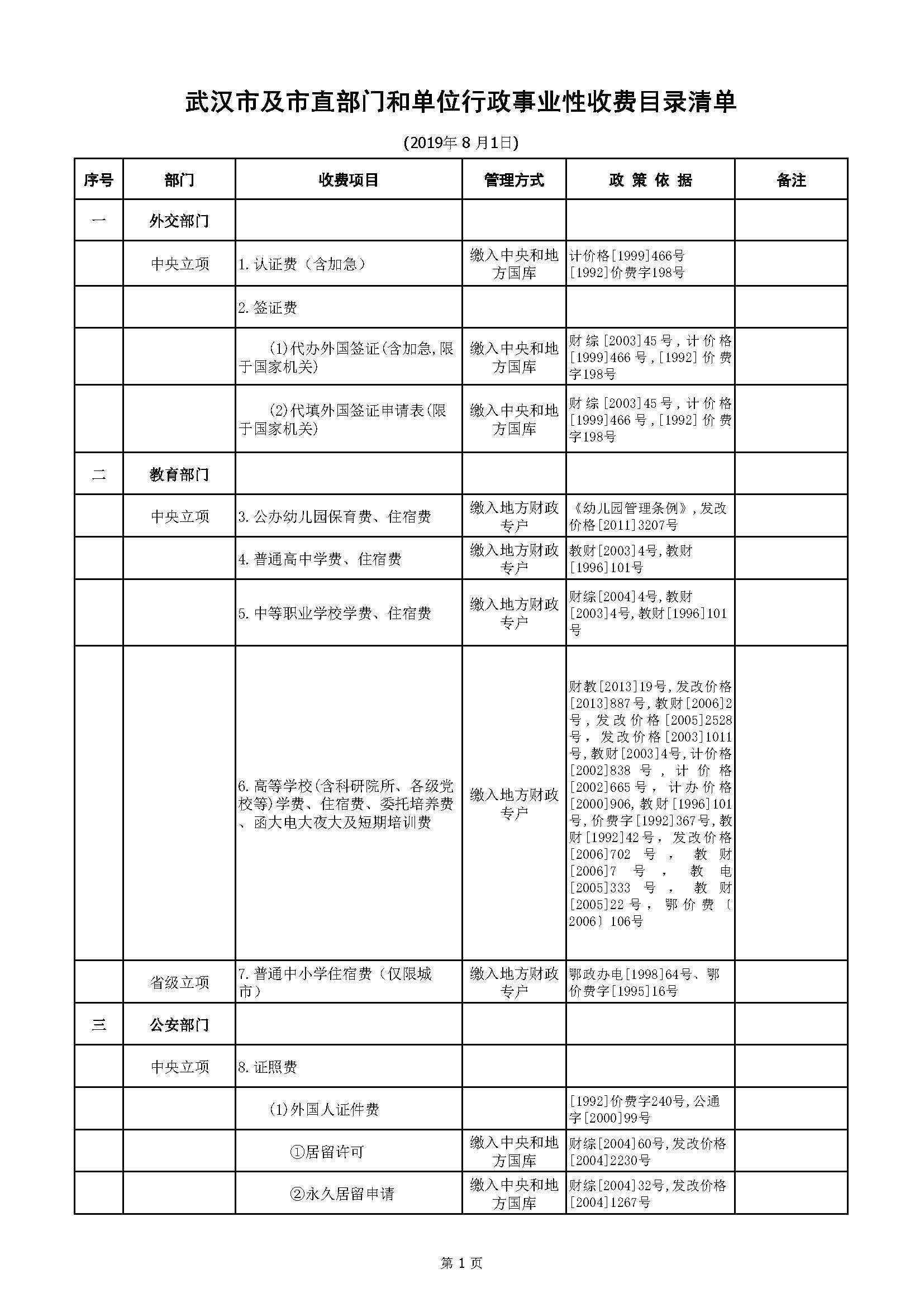 武汉市及市直部门和单位行政事业性收费目录清单(2019年8月1日)